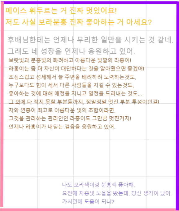 라홍: (그리고 보라분홍의 균형을 맞추기 위해 하나 더 먹어도 괜찮을까요. (ㅋㅋㅋㅋ))